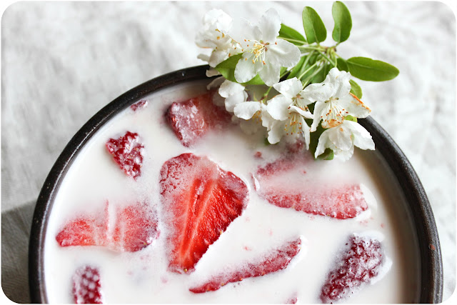 Koks ten gaminimas iš tiesų - užmerki migdolus (galima ir bet kokius kitus riešutus, pvz. lazdyno ar kokoso arba sezamus naudot), susmulkini su šlakeliu vandens - išsispaudi, - pasigamini migdolų pieno, prisipjaustai braškių (man norėjos dar papildomo saldumo tai dėjau raw agavos nektaro..)..:)) mm..